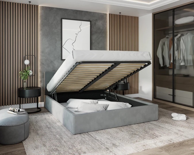 Model RINO łączy wygodę z funkcjonalnością. Pod podnoszonym stelażem ukryty został pojemny schowek na pościel, idealny do przechowywania koców, poduszek czy sezonowych tekstyliów.